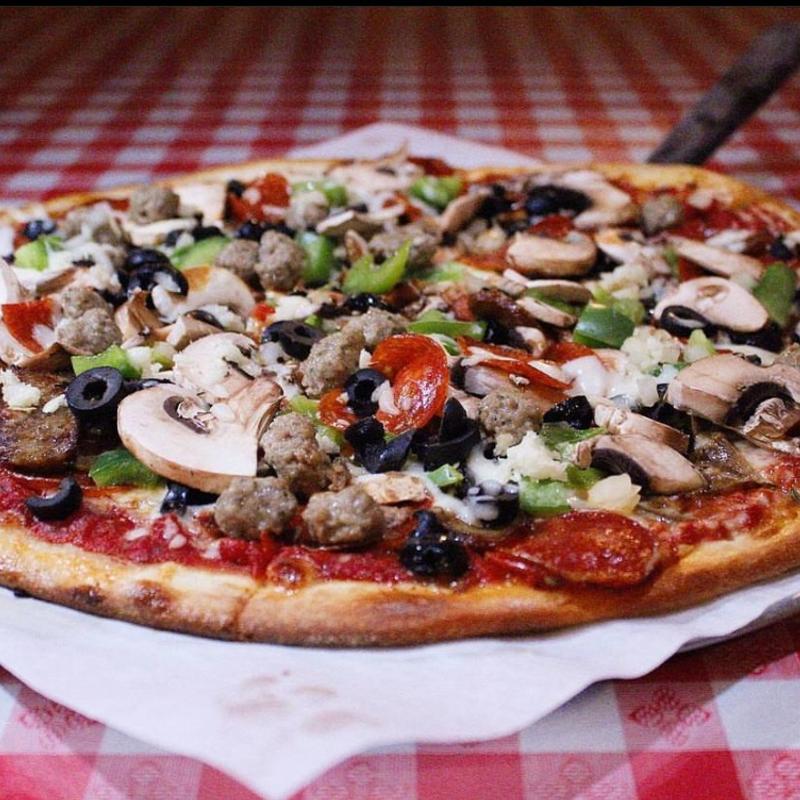 Nine toppings: pepperoni, sausage, onions, black olives, green peppers, mushrooms, meatballs, fresh garlic, & extra cheese.